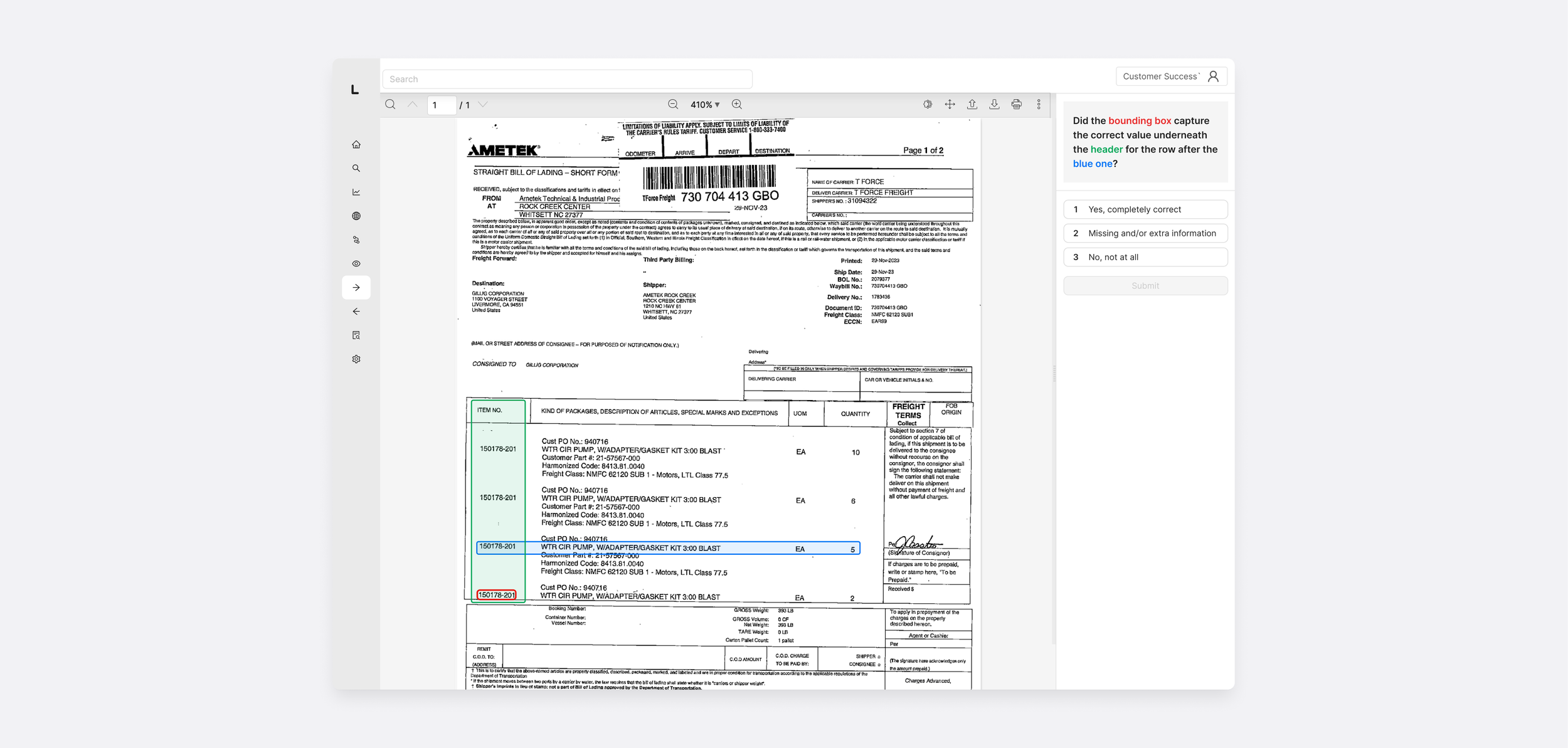 LLM training system for freight document extraction used by BPO agents and AI models. Tasks are created for humans to extract industry-specific information from documents, answers are used in a consensus-based model to determine quality.